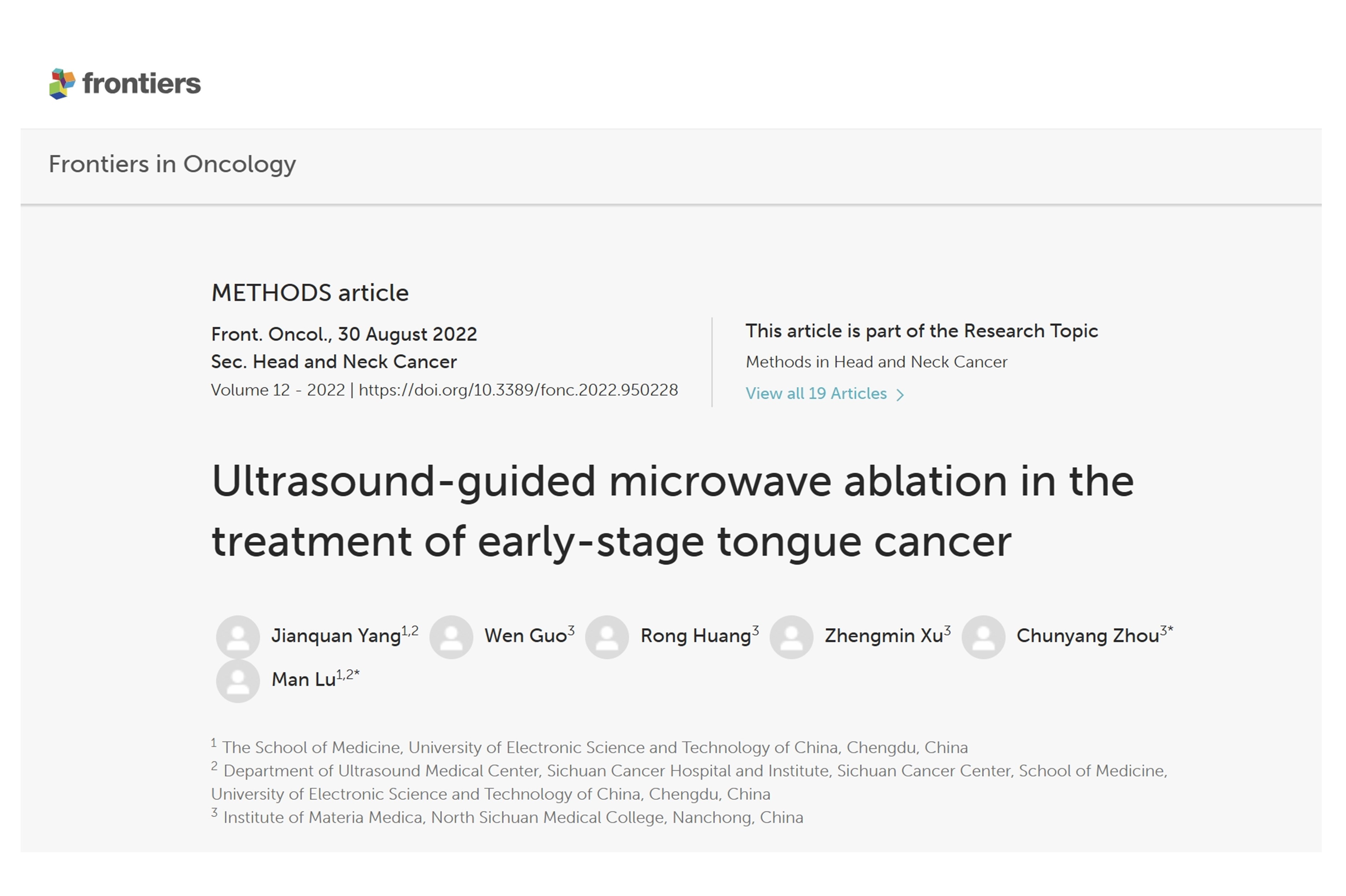 第一例使用超聲引導(dǎo)微波消融治療早期舌癌(early-stage tongue cancer, 簡稱ESTC)的病例。超聲引導(dǎo)微波消融可用于治療早期舌癌,可完全消融腫瘤并保留舌部功能,進(jìn)一步提高患者的生活質(zhì)量。
