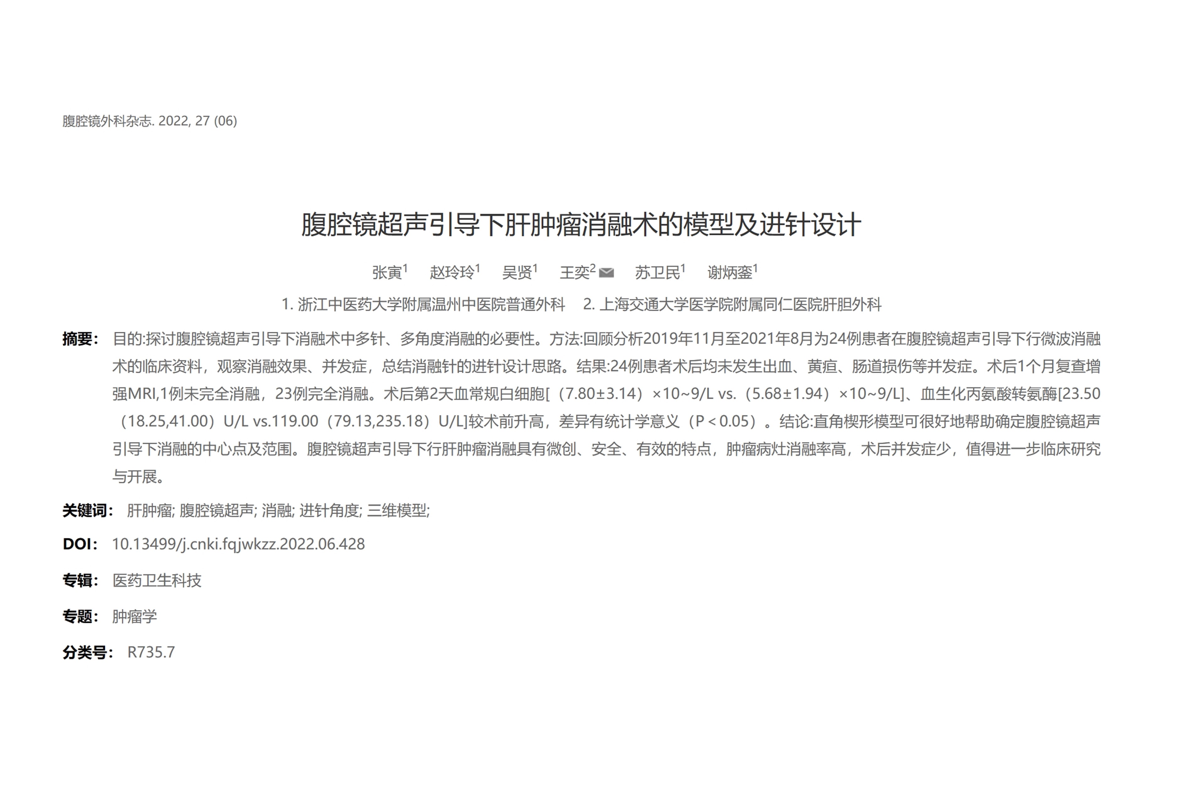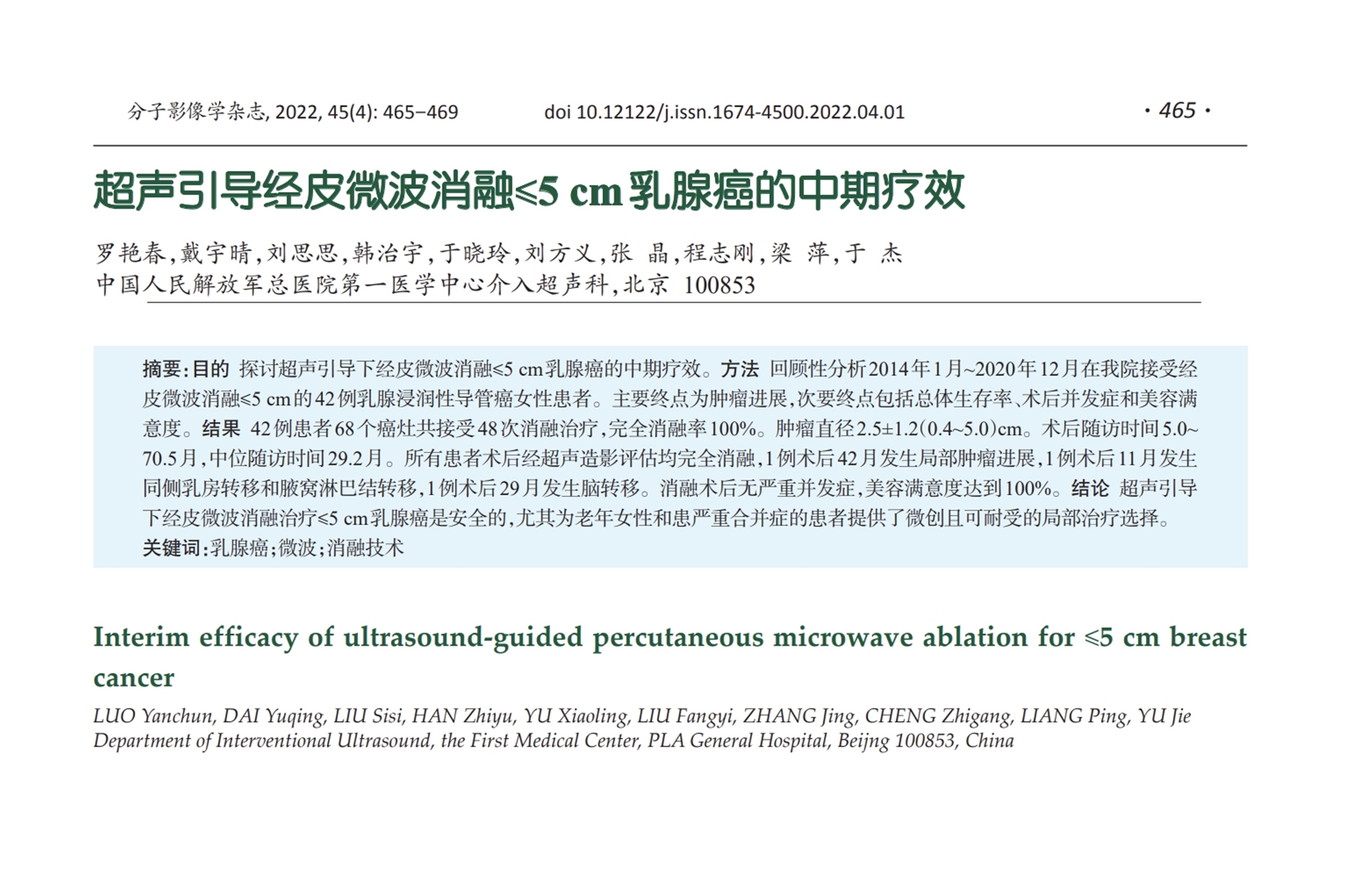 超聲引導(dǎo)下經(jīng)皮微波消融治療 ≤5cm 乳腺癌是安全的,尤其為老年女性和患嚴(yán)重合并癥的患者提供了微創(chuàng)且可耐受的局部治療選擇。